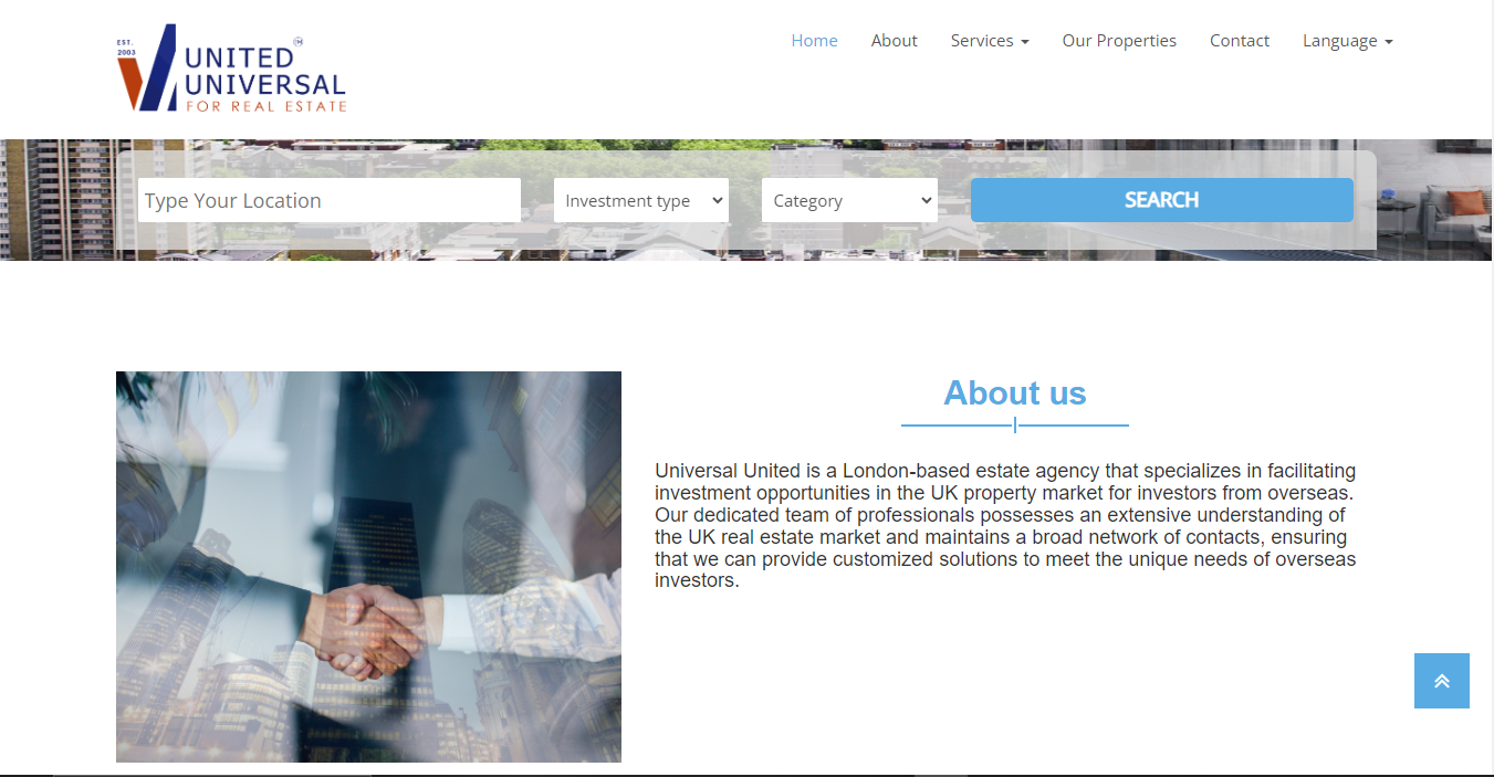 Universal United is a London-based estate agency that specializes in facilitating investment opportunities in the UK property market for investors from overseas. Our dedicated team of professionals possesses an extensive understanding of the UK real estate market and maintains a broad network of contacts, ensuring that we can provide customized solutions to meet the unique needs of overseas investors.